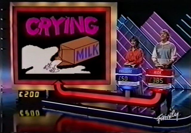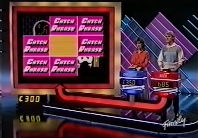 Originellement créé aux États-Unis en 1985, ce n’est cependant pas là-bas qu’il a perduré (il n’y a duré que quelques mois). En revanche, au Royaume-Uni, où il a débarqué en 1986, c’est devenu un véritable succès : en effet, il a été diffusé initialement jusqu’en 2002, soit 18 ans, ce qui n’est pas rien ! Mais ce n’est pas tout : en 2013, une version modernisée est apparue, et est repartie pour une bonne salve de nouvelles saisons, toujours en cours de diffusion… si ce n’est qu’à l’instar de la VF de QVGDM durant les années 2010, la version « classique » de Catchphrase jouée avec des anonymes a fini par s’arrêter (en 2019), pour ne plus laisser place qu’à des spéciales people. Ce qui a tendance à me faire pas mal soupirer, étant donné que vous savez à quel point la présence de people dans les jeux a tendance à quelque peu me gaver… mais je reconnais que, contrairement à QVGDM, l’ambiance de Catchphrase, davantage axée divertissement, se prête bien mieux à du délire.