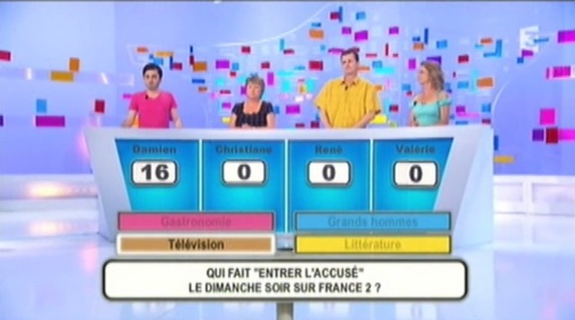 Quatre thèmes lui seront proposés, chacun renfermant 2 questions. Mais en fait, le candidat devra quand même en traiter trois sur les quatre… et en multipliant ça par 4 candidats, ça fait tout de même un total de 12 thèmes traités pour 24 questions. C’est plutôt redondant, mais ça reste globalement plus fluide que la première manche de TLMVPSP (… bon, je triche un peu, les présentations de CVBLF sont tout aussi verbeuses ; mais comme elles sont traitées avant que la manche 1 ne démarre, techniquement elle n’en pâtit pas… mais on se tape quand même une intro bien longue avant de démarrer).