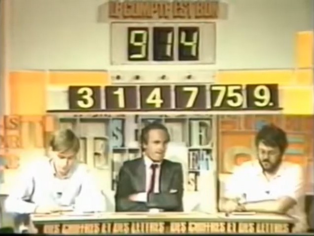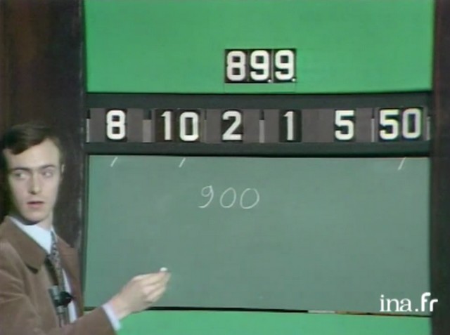 Pour le moment, ce Compte est bon est représenté relativement timidement par rapport au Mot le plus long : en effet, le programme alterne alors deux salves de Mot le plus long avec un Compte et bon. Par conséquent, le Compte est bon n’occupe que 33% du programme, vs. 67% pour le Mot le plus long. Notons que je parle en termes de structure de jeu ; car en durée, le temps de réflexion alloué au Compte est bon est plus élevé.