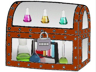Une malle décorée avec des fioles utilisée en chimie. Elle contient peut-être un chat de Schrödinger, mais pour savoir s'il est vraiment vivant et mort, il me faut un code à 4 chiffres pour ouvrir le cadenas.