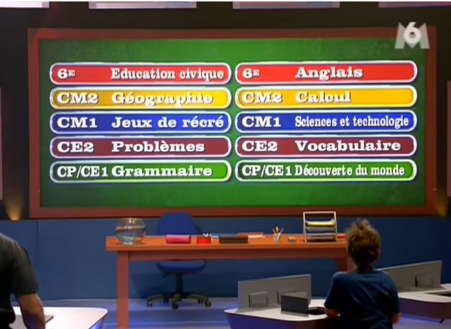 D’un côté, je reconnais que ce jeu fait pas mal d’efforts pour rappeler l’ambiance d’une salle de classe, et que je peux donc difficilement appeler tout ce que je viens de citer des « défauts », puisqu’ils répondent à une vision artistique précise et recherchée. L’habillage de l’émission qui rappelle le tableau à craie va d’ailleurs dans ce sens-là. En outre, ça le différencie pas mal des jeux TV « classiques » qui ont des plateaux de jeu généralement plus standardisés.