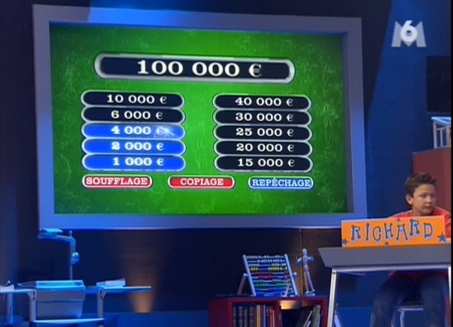 En fait, c’est donc le même joker, décliné de trois façons différentes : puisque, in fine, ça consistera toujours à se reposer sur la réponse de l’élève. Mais du coup, ça permet de rester dans le thème, et de proposer des jokers vraiment spécifiques à ce jeu-là. En outre, bien que le principe soit le même à chaque fois, le degré de risque ne sera pas le même : ainsi, si les candidats auront souvent eu recours au Soufflage, peu d’entre eux auront osé le Copiage qui était beaucoup plus risqué.