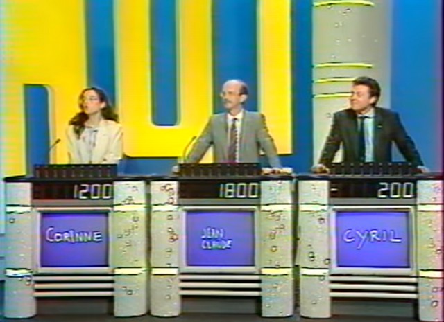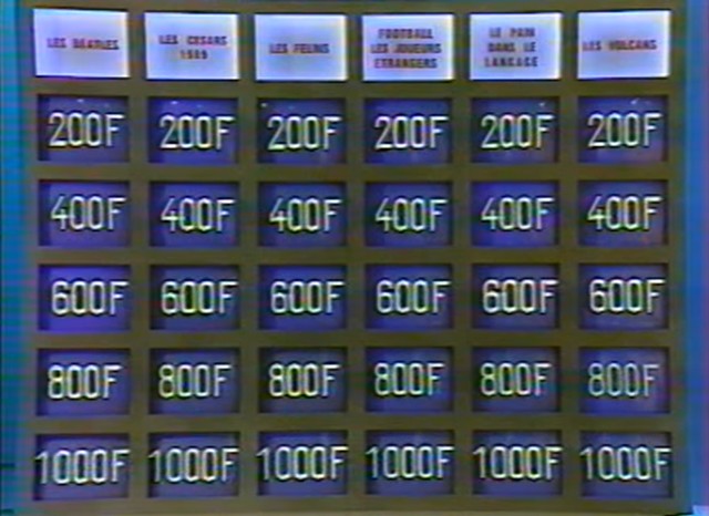 Le champion (oui, il y en a un… mais bon, c’était l’époque où le nombre de participations était limité à 5, et c’est le seul moment où son statut a un peu d’importance, donc ça reste léger) commence et indique la case du tableau (le thème et le montant en jeu) avec laquelle tout le monde va jouer. L’animateur donne alors la réponse derrière la case, et les candidats jouent au buzzer. Le plus rapide propose sa question : si elle est correcte, il accumule dans sa cagnotte le montant correspondant ; mais si elle est incorrecte, il perd autant d’argent que le montant mis en jeu, et les autres candidats peuvent tenter une proposition à leur tour.