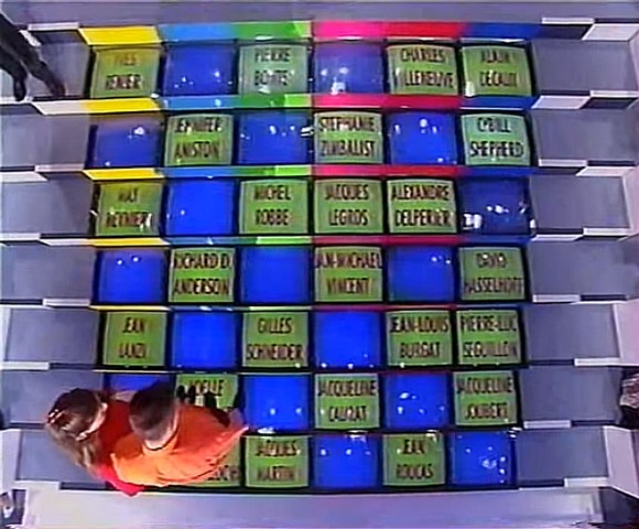 Car nonobstant le manque d’informations sur son déroulement, j’ai quand même pu voir à quoi ressemblait plus précisément ce programme, grâce à un youtubeur qui a eu la bonne idée d’en conserver un numéro. Et… ça valait le coup d’œil, ne serait-ce que pour voir ce qui fut à la fois l’une des premières productions de Catherine Barma via sa société Tout sur l’écran, mais également la seule de cette boîte à être un jeu TV (sauf si on compte On n’demande qu’à en rire dans ce genre-là… mais c’est pas trop mon cas), celle-ci nous ayant surtout habitués à des talks et des émissions d’opinion par la suite. On sent d’ailleurs un peu cette patte, dans le jeu, et ce n’est pas sans apporter un petit plus à son ambiance. Mais sans plus tarder, lançons-nous plus en détail dans le visionnage.