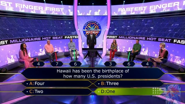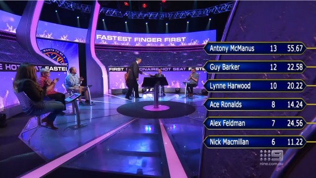 Et quelque part, c’est un peu le cas de ce Fastest Finger First : en effet, il n’a rien de vraiment indispensable à la partie « Hot seat », quand on y pense ; et son but n’est in fine que de permettre à un candidat de gagner un bonus. Même pas d’agir en tant que manche de sélection, puisque le premier candidat à démarrer la partie « Hot seat » est juste celui qui est assis le plus à gauche, et non celui qui a gagné la manche… bref, passer dix minutes juste pour ça, c’est un peu léger.