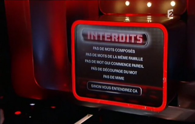 J’ai même l’impression que par moments, le jeu a tendance à un peu oublier cette règle. Je suis déjà tombé sur une émission où elle était pourtant édictée au début, mais où pour faire deviner « concret », celui qui devait deviner avait dit « abstrait », et celui qui devait faire deviner a dit « contraire »… pourtant, « contraire » et « concret », ça commence pareil, ça aurait dû être bipé selon leur logique !