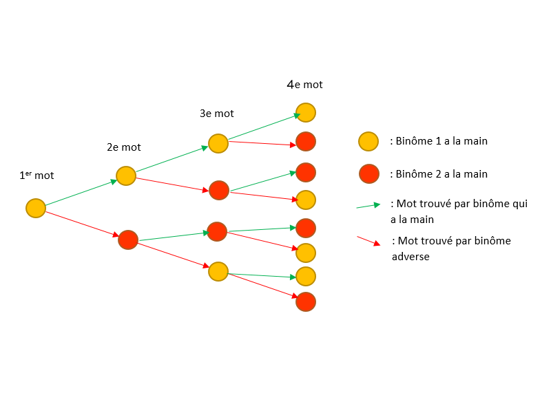 Le premier binôme joue, et deux scenarii peuvent se produire : soit il ne trouve pas le mot, soit il le trouve (oui, je sais, c’était un raisonnement pas évident). Mais après (toujours si on exclut le tirage de boules), ce scénario se répète. Puis il se répète encore une fois, etc. jusqu’à ce que la première manche se termine.