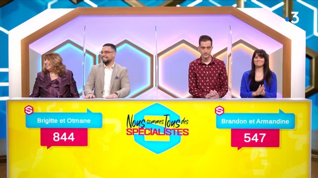 Ensuite, une fois les deux questions posées, une seconde passe est effectuée, avec un nouveau choix entre trois spécialistes. Mais cette fois-ci, les questions vaudront 400 points ; et les candidats choisissent la question non pas pour eux, mais pour le binôme adverse ! Donc l’idée est plutôt d’essayer de les mettre en difficulté sur un thème qui risque de moins inspirer. Un twist plutôt rafraîchissant et bien pensé pour conclure la manche ; et qui, en outre, est beaucoup plus satisfaisant que dans TLMVPSP dans la mesure où c’est mutuel… (désolé, j’ai dit un peu trop de bien de TLMVPSP dans ma critique précédente, donc faut que je me rattrape ; et puis bon, quelque part, ça montre aussi qu’Effervescence a appris de ses erreurs passées…)