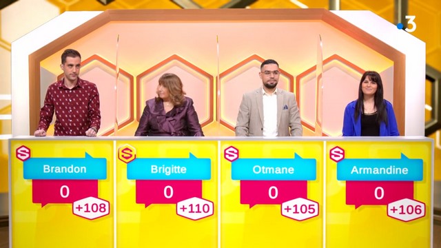 Mais ici, c’est davantage précis : en effet, ce n’est pas le classement des candidats par rapidité qui va importer, mais le temps qu’ils vont mettre pour valider leur réponse. Ainsi, chaque question peut rapporter un maximum de 100 points (120 au début) ; toutefois, chaque dixième de seconde perdu avant de valider une réponse fait perdre un point. Ainsi, si un candidat met 6,2 secondes à répondre, et que sa réponse est juste, il gagnera 100 – (6,2 x 10) = 48 points. Ce n’est pas un calcul très compliqué, et le principe en lui-même est suffisamment intuitif pour qu’il puisse être compris facilement en regardant. Bon, ça rend les 100 points théoriquement inatteignables (personne ne pouvant répondre à la vitesse de l’éclair…), mais c’est très mineur.