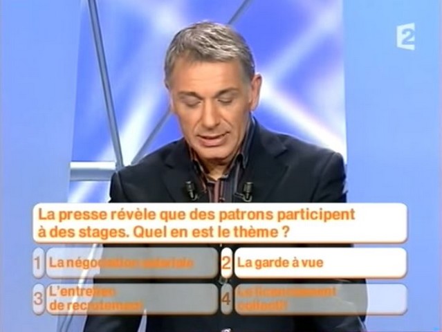… même si je me demande comment se passe le cas de figure (un peu extrême certes) où aucun candidat ne souhaite enchérir sur une question. Est-elle tout simplement passée ? Et comment on fait si personne ne décide jamais d’enchérir ? Bon, je vais chercher un peu loin, certes ; d’autant plus que le montant des mises n’est pas exorbitant non plus, et qu’il y aura sans doute toujours au moins un candidat pour proposer ne serait-ce qu’une enchère. J’aurais quand même été curieux de savoir comment se passait le cas de figure « zéro enchère », n’ayant dans mon souvenir jamais assisté à ça, mais j’imagine que la production traitait ça de la façon la plus simple, en passant la question.