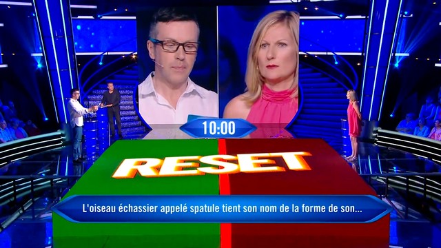 Tout d’abord (enfin, façon de parler, puisqu’ils peuvent être utilisés dans n’importe quel ordre), on a le « Reset », activable par celui qui répond aux questions. Lorsqu’il s’estime en grande difficulté, le candidat peut appuyer sur le buzzer à côté de lui ; ce qui aura pour effet de ramener instantanément le curseur dans la zone centrale (il continuera cependant à progresser continuellement vers la droite). Ce qui le rend donc intéressant à utiliser soit quand le curseur se rapproche trop dangereusement du bord droit ; soit quand il reste trop peu de temps pour espérer faire une remontada spectaculaire (auquel cas, suite au reset, il suffira de répondre correctement à une ou deux questions pour revenir en zone verte).