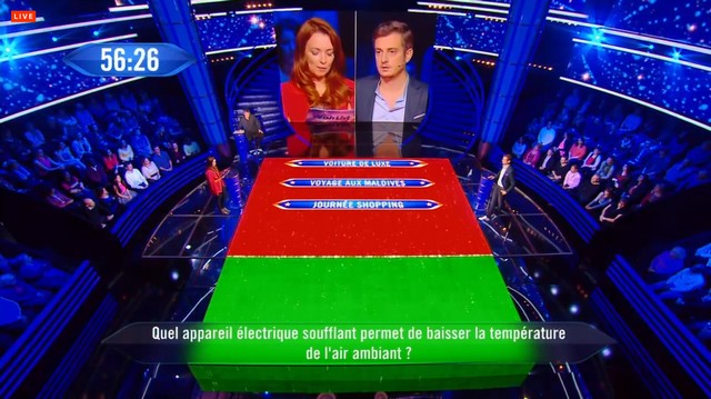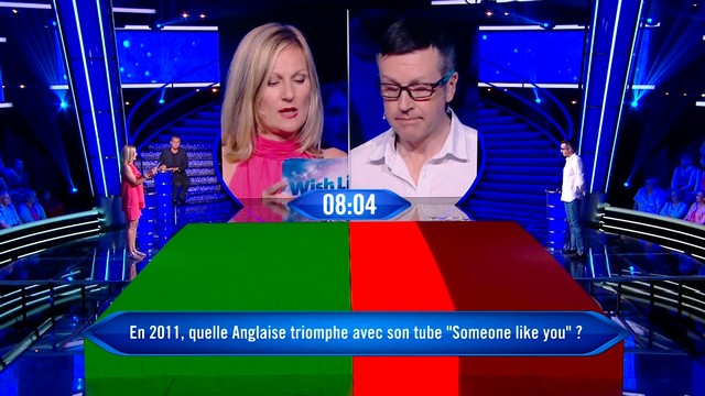 Pour ce faire, le candidat de droite doit répondre correctement aux questions posées par son binôme ; ce qui aura pour effet de décaler le curseur vers la gauche d’une trentaine de centimètres (enfin, à la louche, vu que c’est un peu difficile à estimer visuellement) d’un coup. Les mauvaises réponses ou les questions passées n’ont pas d’effet négatif particulier (à part faire perdre un peu de temps), le curseur continue juste à se déplacer progressivement vers la droite.